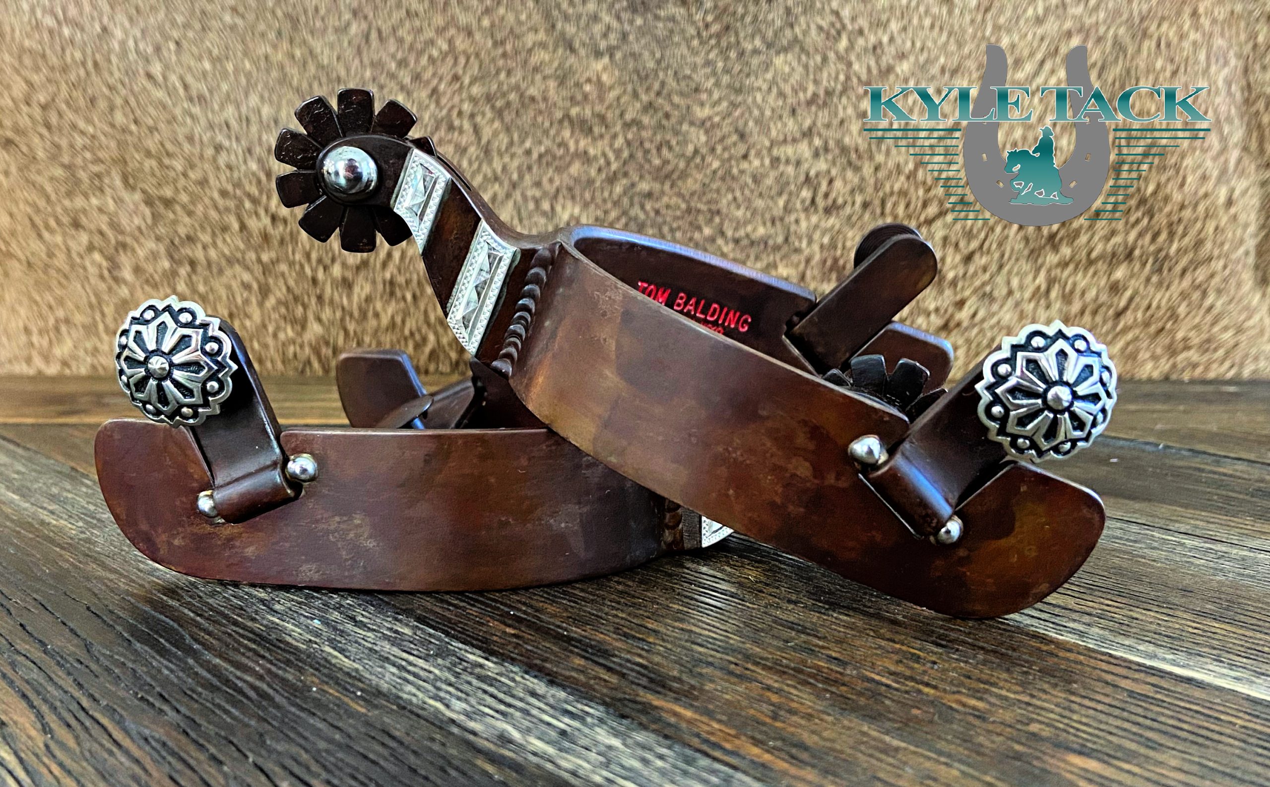 Tom Balding Handmade Spurs – Browned Finish – Ladies Heelband 1" Tall – #6 Shank – U Rowel – 2 Engraved Silver Bars on Shank