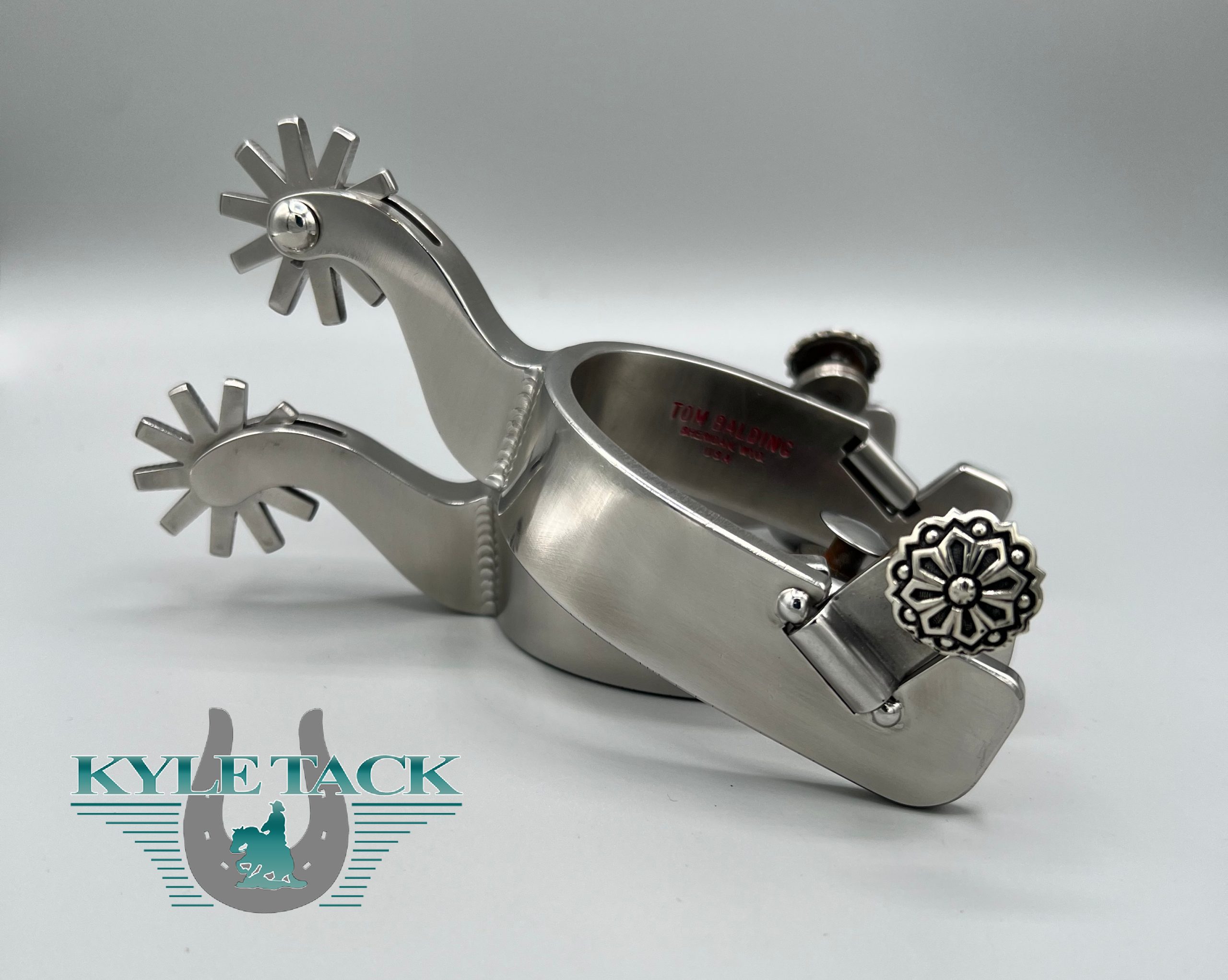 Tom Balding Handmade Spurs – Stainless Finish – Ladies Heelband 1" Tall – Shank 4 – Rowel J1