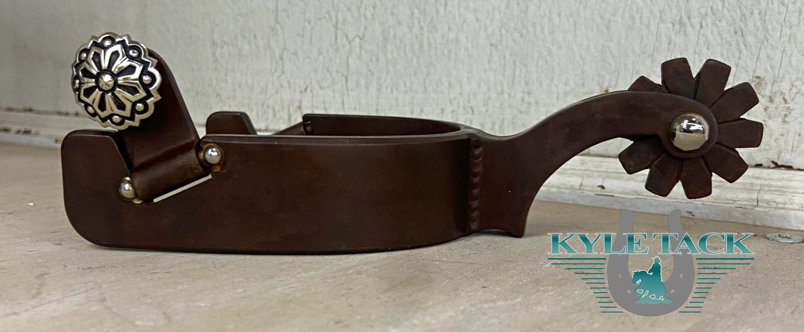 Tom Balding Handmade Spurs – Browned Finish – Ladies Heelband 1" Tall – #8 Shank – 2 1/8″ – Rowel V 1 1/4″ – 10 Point