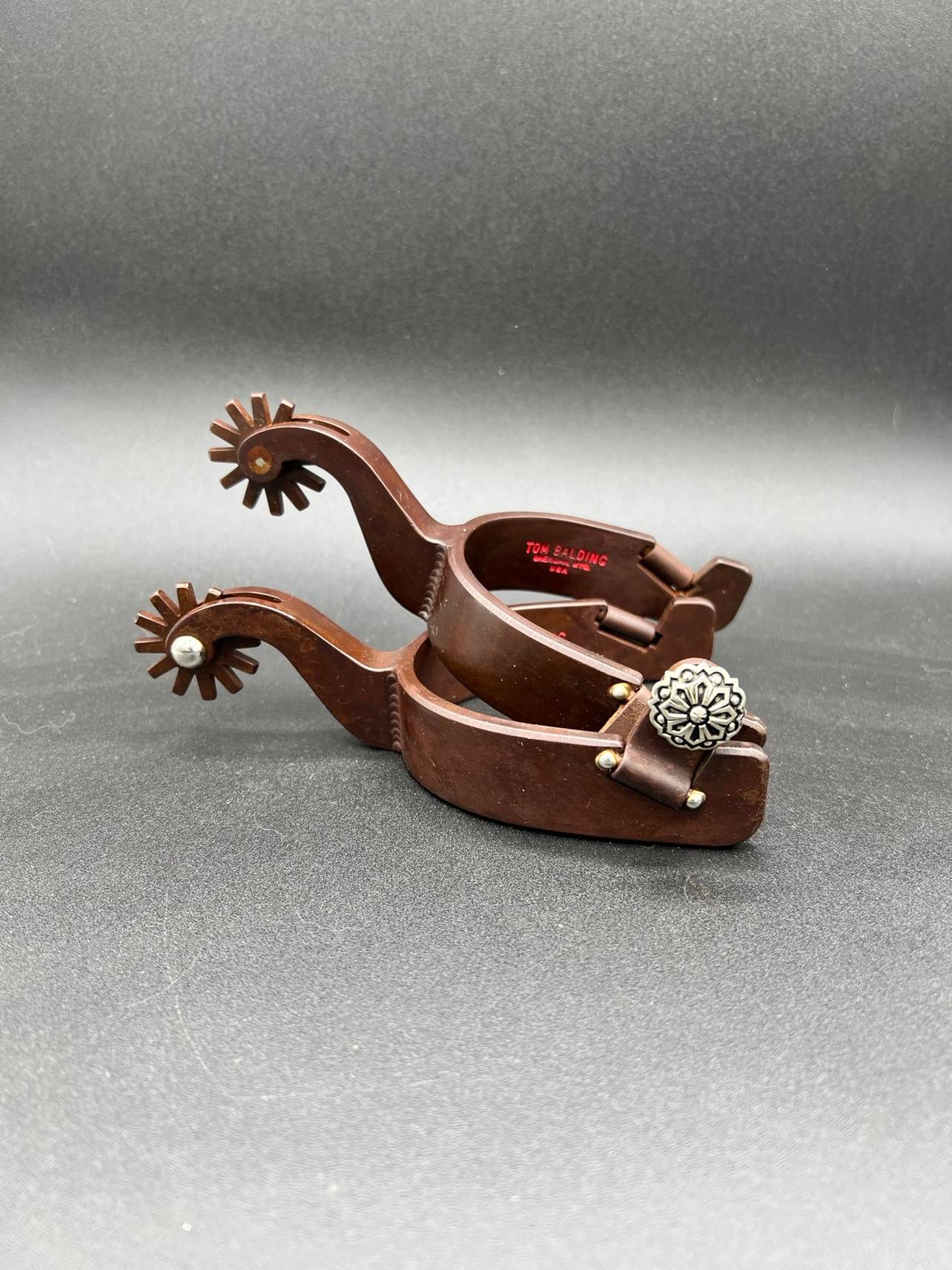 Tom Balding Handmade Spurs – Texas Style – Browned Finish – Ladies Heelband 1" Tall – Shank 17 – Rowel E2