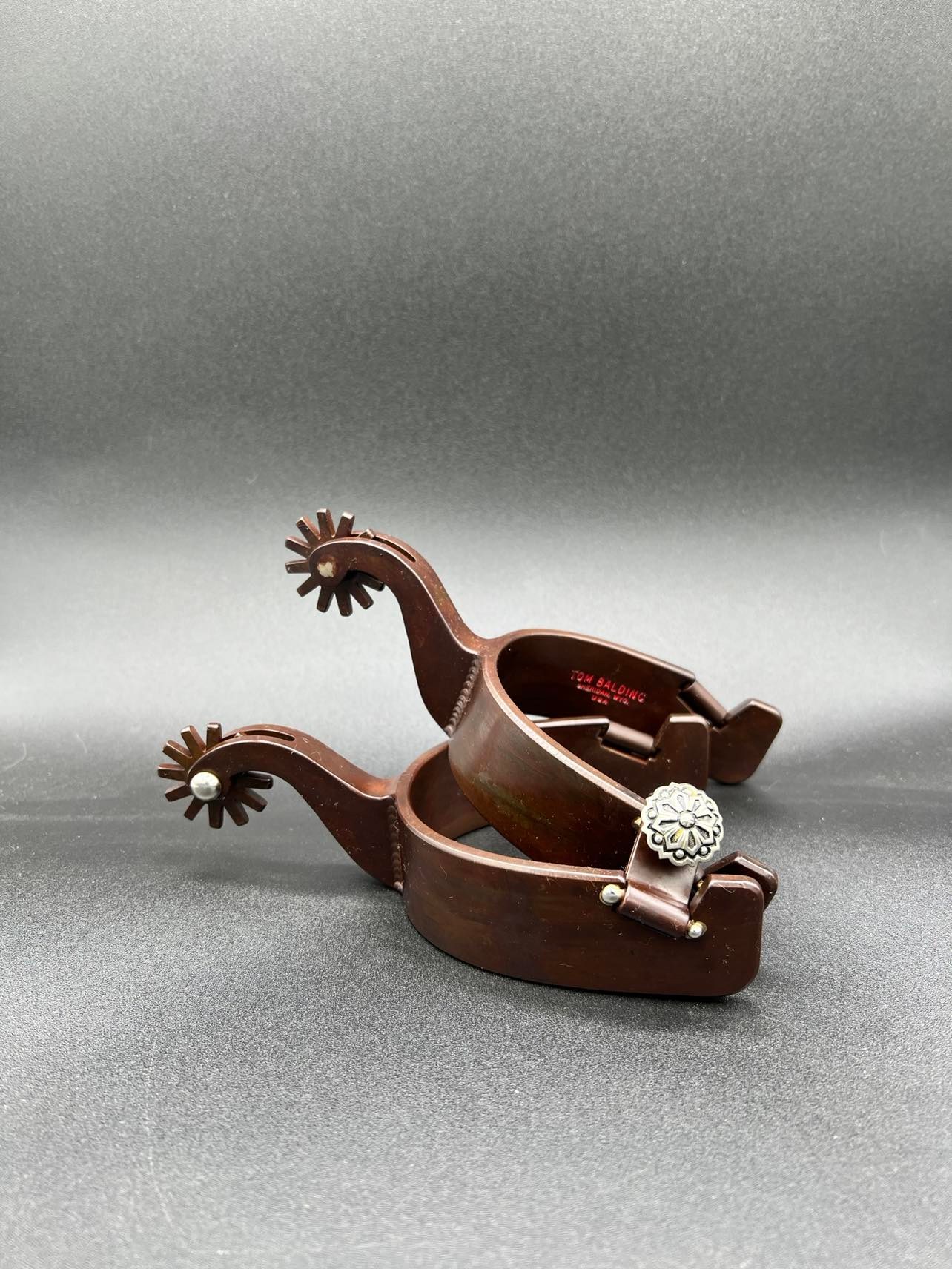 Tom Balding Handmade Spurs – Texas Style – Browned Finish – Mens Heelband 1.25" Tall – Shank 17 – Rowel E2