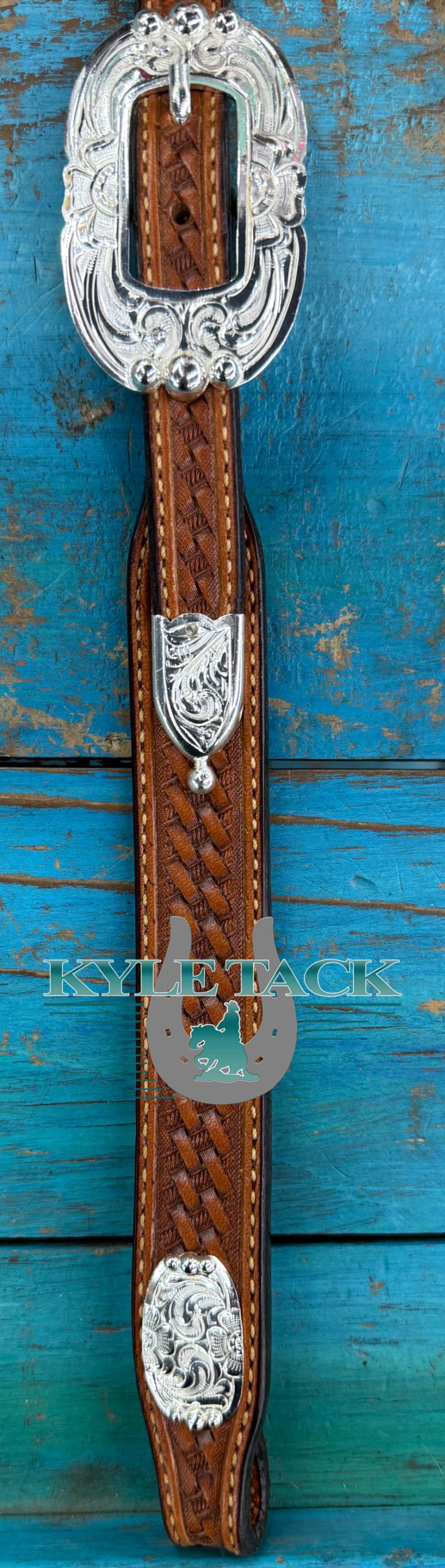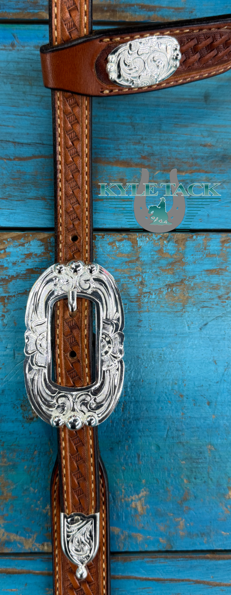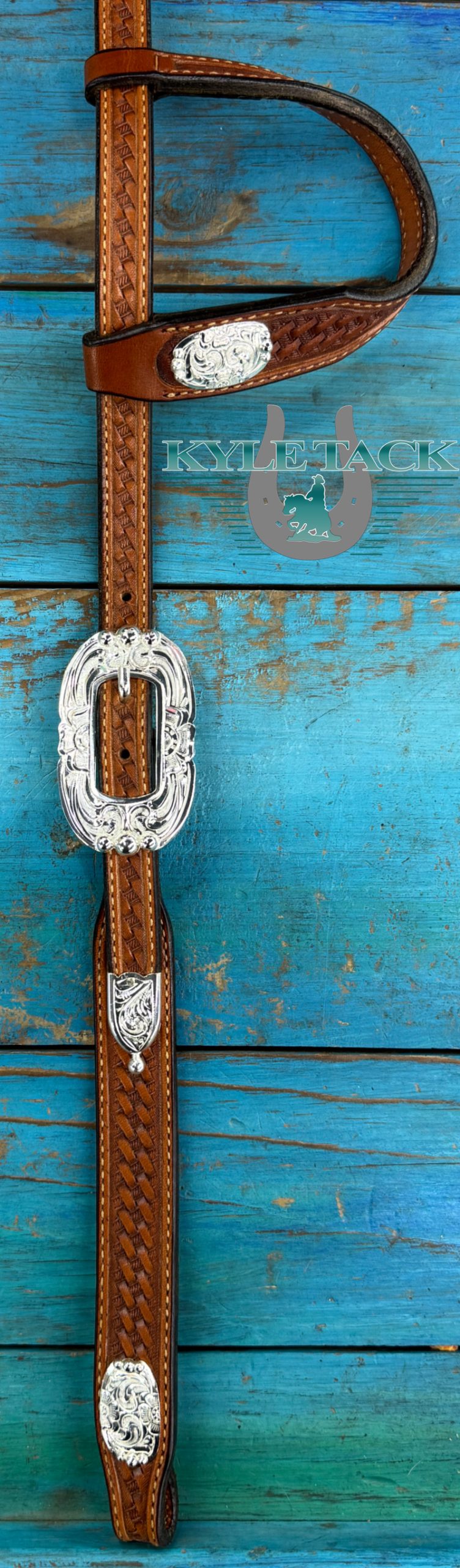 Hansen Designed Headstall – Zuni Beaded Bright Cut Plated Silver – Double Sliding Buckle Set 3) Oval Beaded Conchos – Basket Tooled – Single Ear – Medium Oil